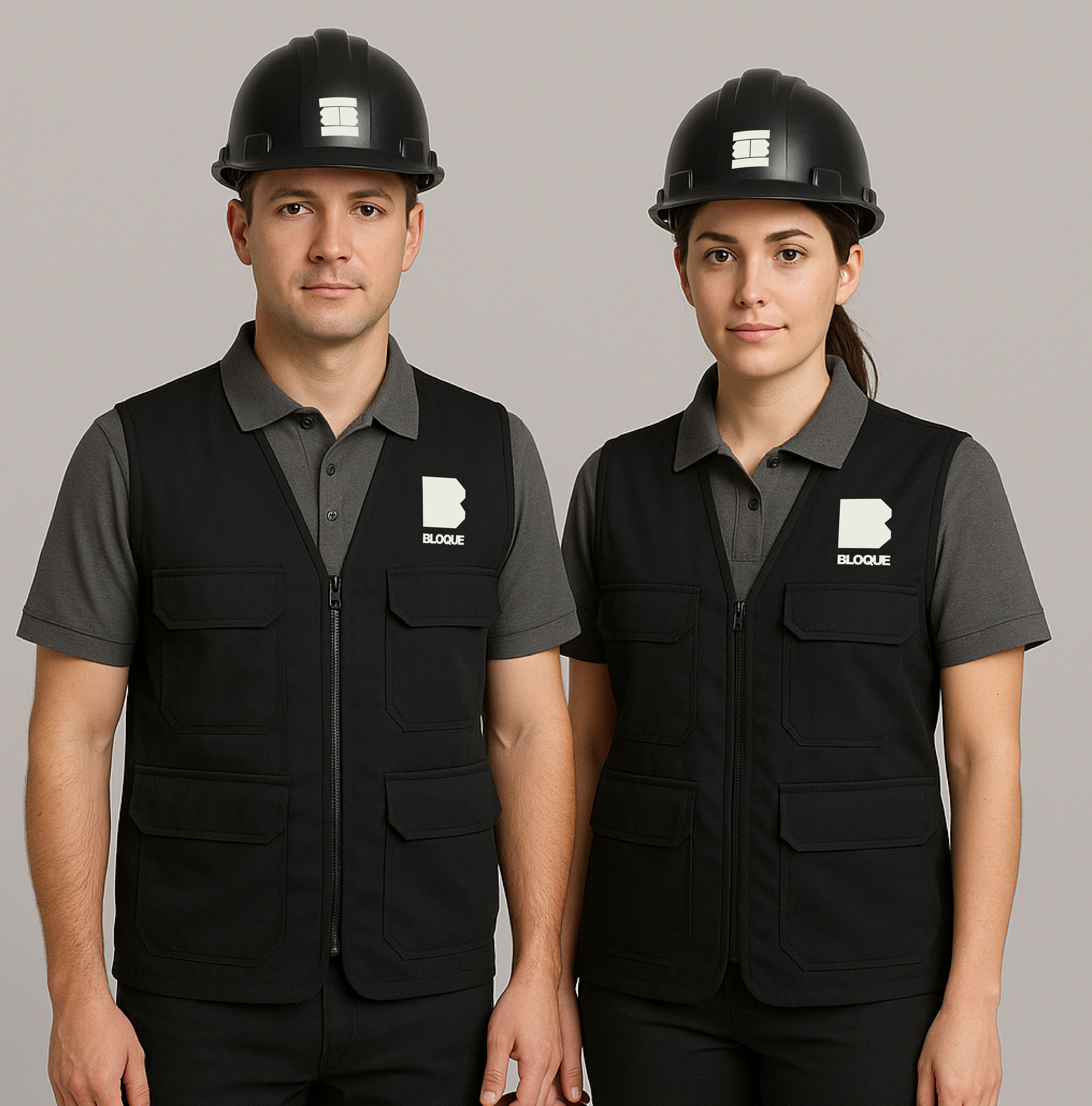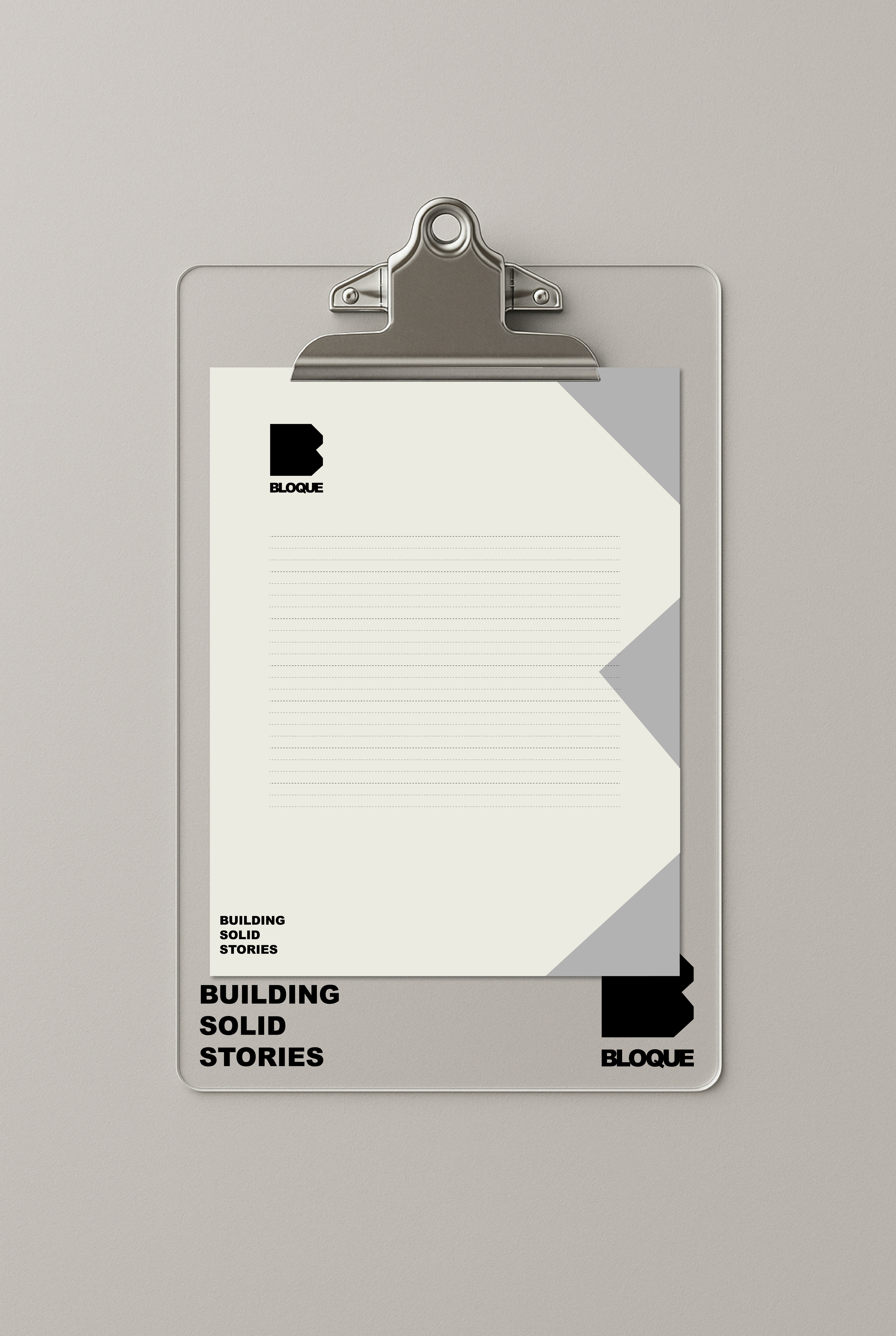 El sistema visual se despliega en tarjetas, señalética de obra, uniformes y materiales impresos, creando una imagen coherente, limpia y funcional. Bloque está diseñada para construir historias sólidas a través de arquitectura y técnica.