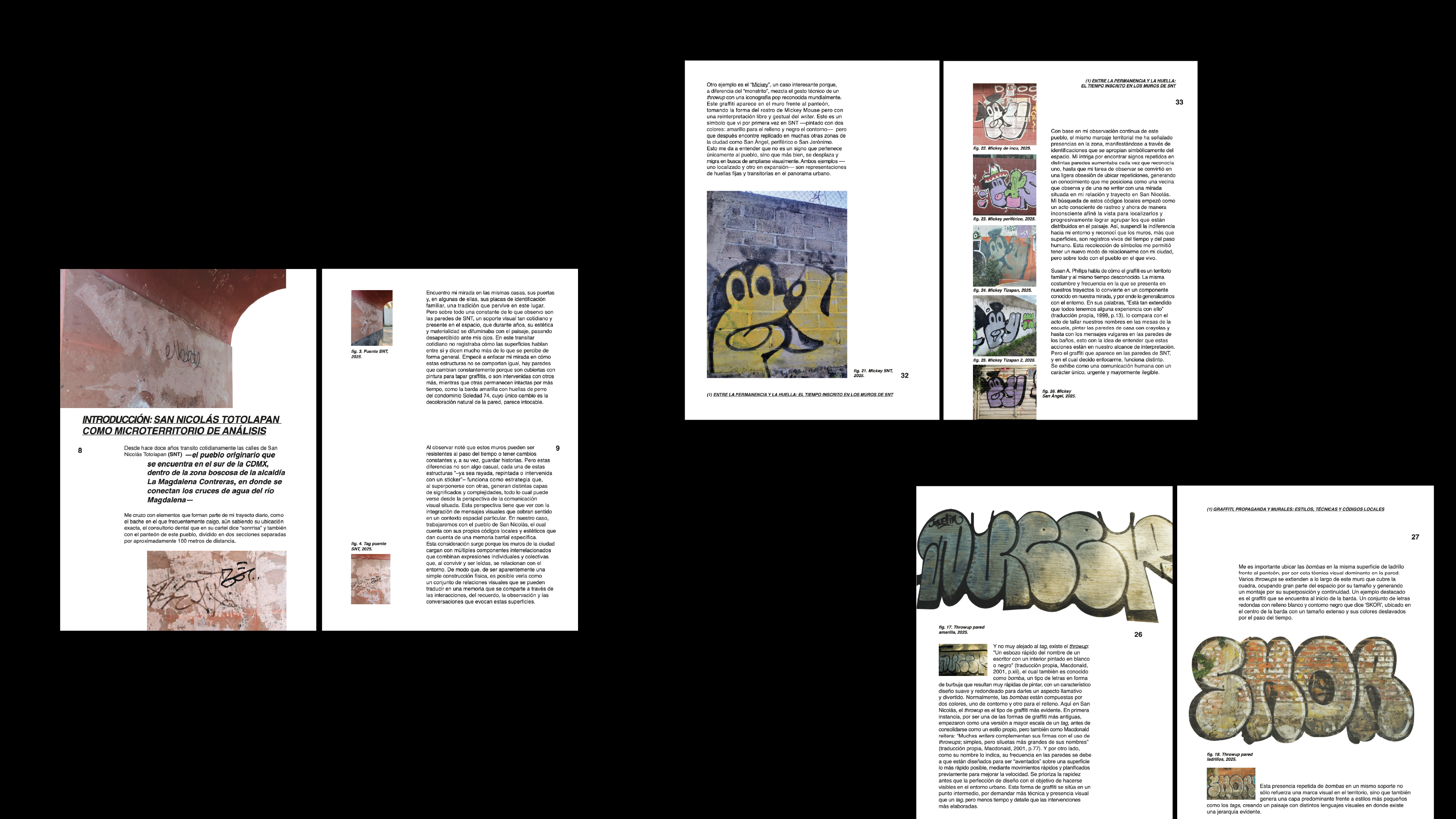 Muros como cuerpos es mi investigación de tesis, un proyecto visual y afectivo sobre los muros de San Nicolás Totolapan. A través de recorridos, registro fotográfico y diálogo con habitantes, analicé cómo estas superficies actúan como archivos vivos de memoria colectiva. Mi tarea fue observar cómo las capas visuales —graffiti, murales, propaganda— no solo comunican, sino que encarnan afectos y formas de habitar el territorio. El proyecto busca leer lo cotidiano desde el muro, entendiendo su materialidad como lenguaje emocional y social.