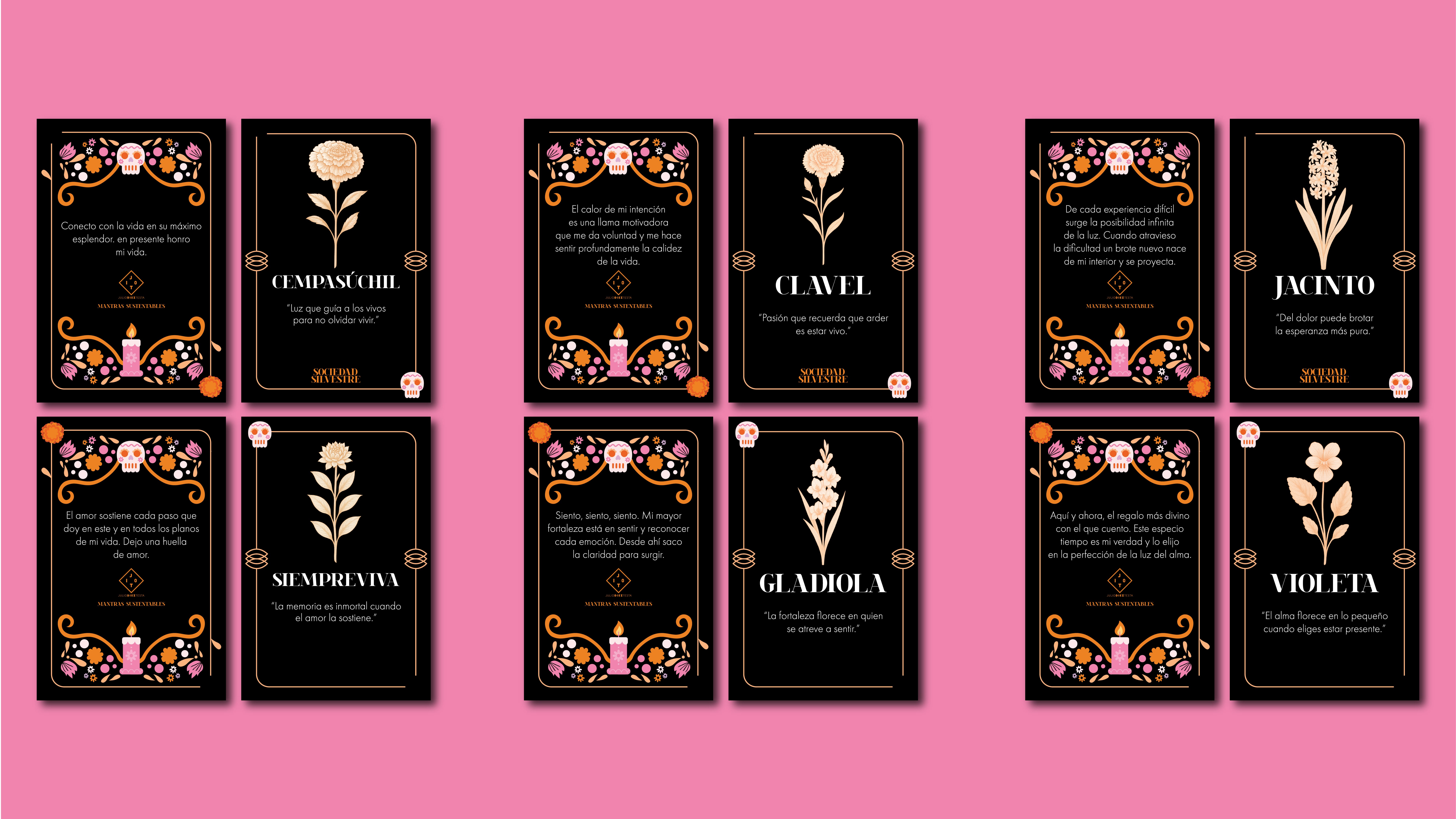 Proyecto de ilustración y diseño editorial para crear un oráculo botánico inspirado en el Día de Muertos. Cada carta representa una flor con un mensaje simbólico que conecta con la memoria, la intuición y los rituales de la marca.