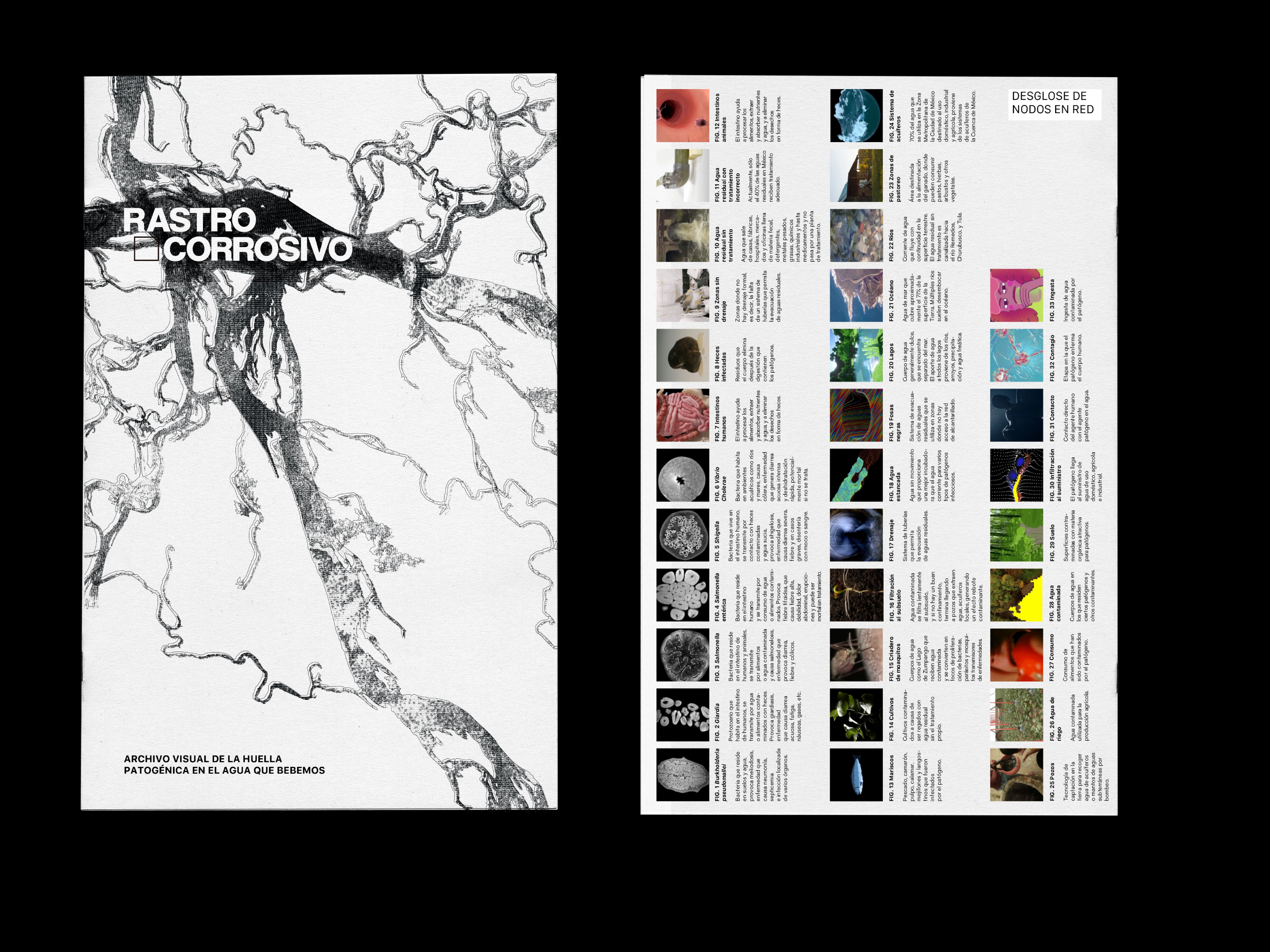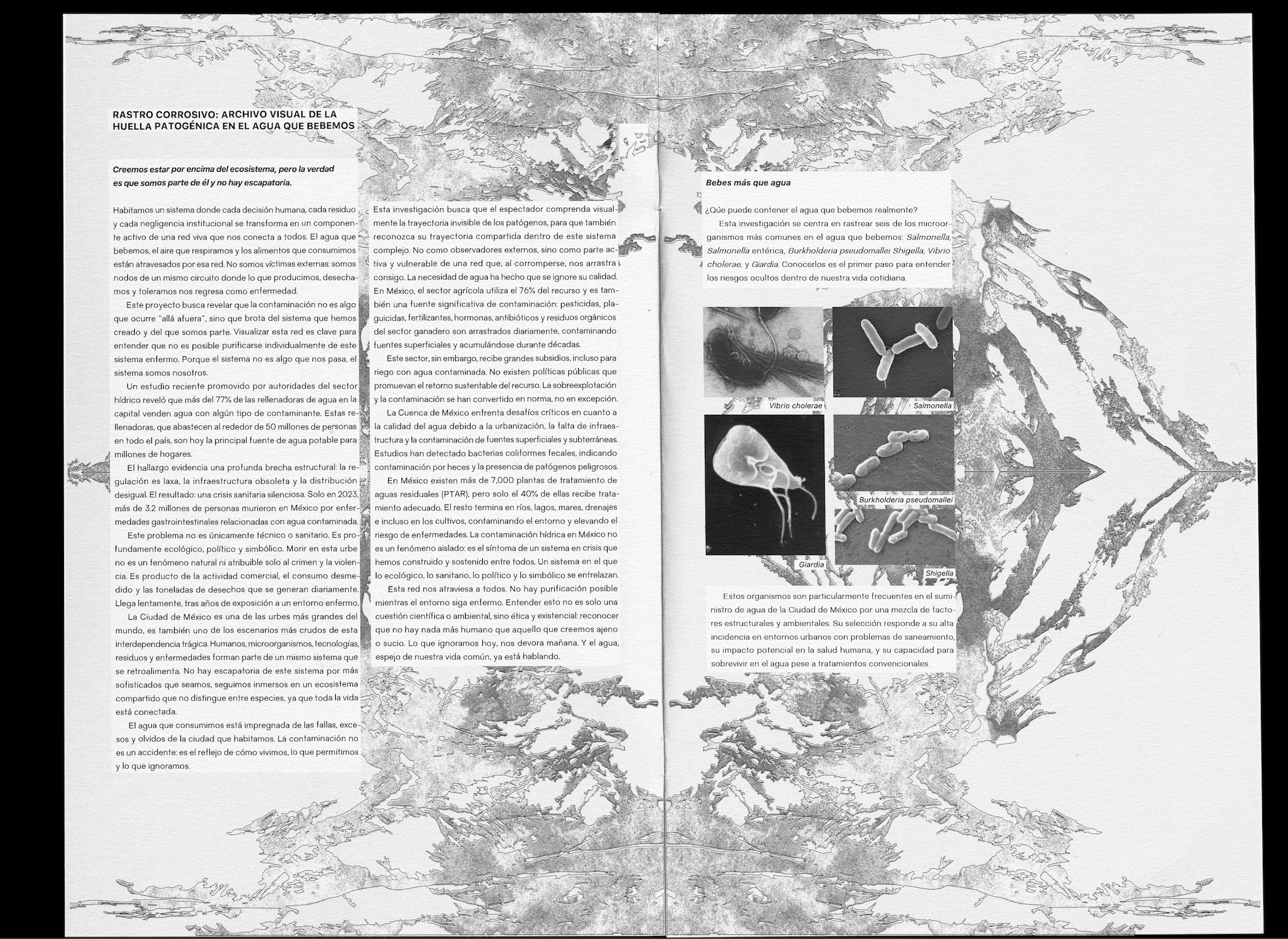 Rastro Corrosivo es un archivo visual de la huella patogénica en el agua que bebemos dentro de la Ciudad de México. Este proyecto visual investiga y expone la ruta que siguen los patógenos desde su origen hasta su ingreso al cuerpo humano a través de su infiltración en el suministro de agua de la ciudad. Esta investigación busca que el espectador comprenda visualmente la trayectoria invisible de los patógenos, para que también reconozca su trayectoria compartida dentro de este sistema complejo.